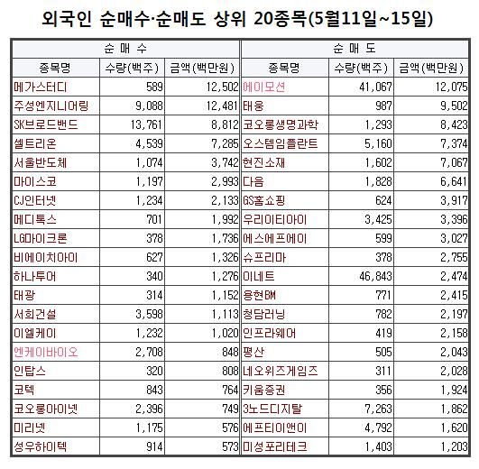 반면 메가스터디는 125억200만원 순매수하고 주성엔지니어링(124억8100만원 순매수), SK브로드밴드(88억1200만원), 셀트리온(72억8500만원) 등을 사들였다.