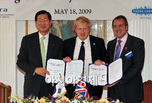 18일 오후 서울 장충동 신라호텔에서 열린 코트라(KOTRA) - 씽크 런던(Think London) 협력 양해각서(MOU) 체결식에서 참석자들이 양해각서 체결후 기념촬영을 하고 있다.(왼쪽부터) 조환익 KOTRA사장, 보리스 존슨 런던시장, 마이클 찰톤 씽크 런던 사장
