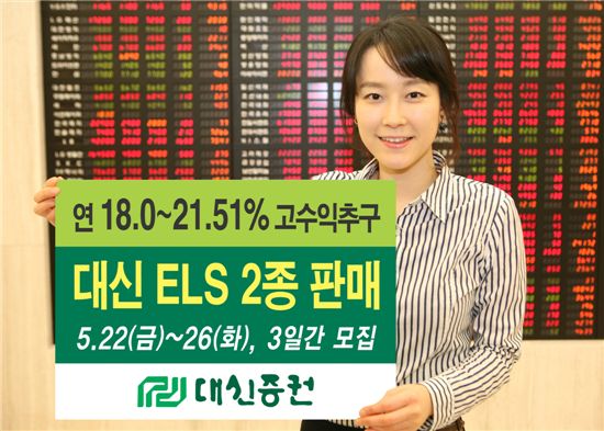 대신증권은 만기 2년짜리 조기상환형 주가연계증권(ELS) 2종을 오는 22~26일 각 영업점에서 판매한다고 21일 밝혔다.