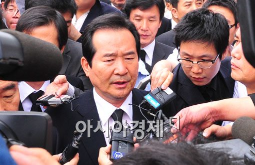 정세균 민주당 대표가 23일 노무현 전 대통령 시신이 안치된 양산 부산대병원을 침통한 표정으로 방문하고 있다.
