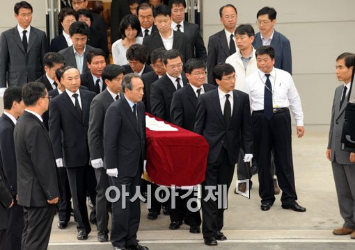 노무현 전 대통령의 시신이 23일 오후 5시30분경 봉하마을로 가기 위해 운구차로 옮겨지고 있다.