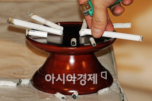 노무현 전 대통령 서거 이틀째인 24일 새벽 경남 김해시 진영읍 본산리 봉하마을에 마련된 분향소에서 한 추모객이 노 전 대통령이 생전 즐기던 담배를 올리고 있다.