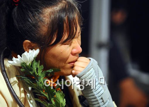 노무현 전 대통령이 서거한 24일 새벽 빈소가 마련된 경남 김해 봉하마을회관을 찾은 한 조문객이 헌화하며 오열하고 있다.