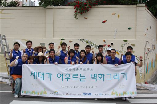 현대하이스코(대표 김원갑)는 지난 22일 금천구 시흥동에 위치한 혜명양로원에서 임직원 및 대학생 홍보대사, 인근 초등학교 학생 등이 참가한 가운대 벽화그리기 활동을 진행했다.