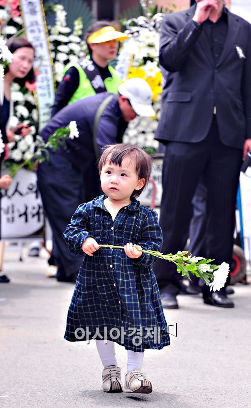 노무현 전 대통령 서거 2일째를 맞이한 24일 경남 김해 봉하마을에 마련된 빈소를 찾은 한 어린아이가 노 전 대통령 영정에 바칠 꽃을 들고 있다.