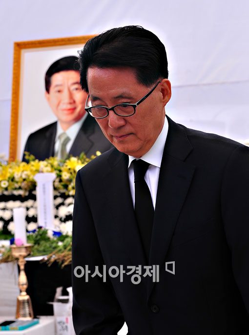 노무현 전 대통령 서거 2일째를 맞이한 24일 경남 김해 봉하마을에 마련된 빈소에 박지원 민주당 의원이 빈소를 찾아 헌화를 마치고 있다.