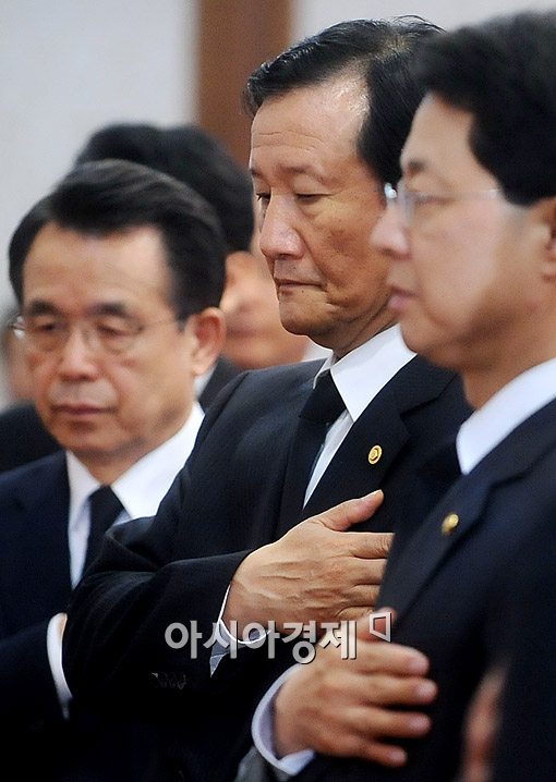 [아시아경제신문 이기범 기자]$pos="C";$title="국무의원";$txt="";$size="510,718,0";$no="200905241650330259624A_1.jpg";@include $libDir . "/image_check.php";?>노무현 전 대통령의 장례가 국민장으로 결정된 가운데 24일 오후 한승수국무총리 주재로 세종로 정부청사에서 열린 임시국무회의에서 한 총리를 비롯해 윤증현 재정기획부장관 등 국무위원들이 굳은 표정으로 국민의례를 하고 있다.