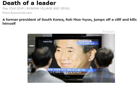 영국 경제 전문지 이코노미스트는 24일 '지도자의 죽음(Death of a leader)'이라는 제목의 기사와 함께 시민들이 노 전 대통령의 서거 보도를 지켜보고 있는 화면을 홈페이지 메인에 전면 배치했다.