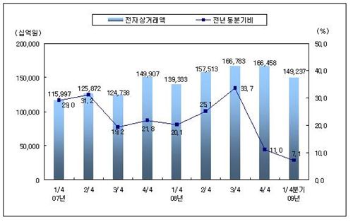 통계청이 26일 발표한 ‘2009년 1분기 전자상거래 및 사이버쇼핑 동향’에 따르면, 올해 1분기 전자상거래 총거래액은 149조2370억원으로 지난해 같은 기간에 비해 7.1% 증가하며 전년 동분기대비 사상 최저치의 증가율을 기록했다.