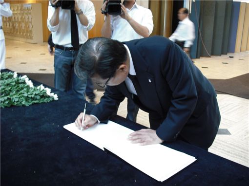 손 회장은 방명록에 "길이 영혼의 안식을 얻으시길 바랍니다"라고 글을 남겼다.