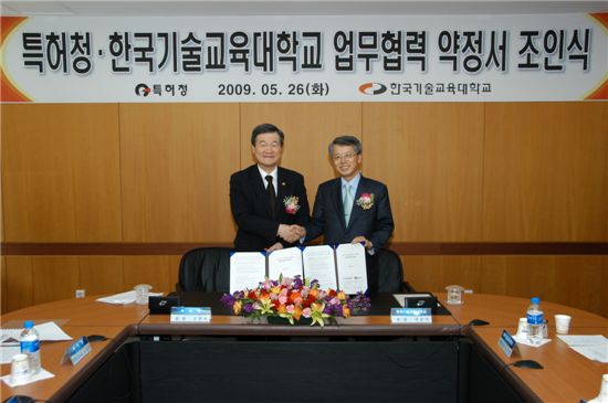 고정식 특허청장(왼쪽)과 전운기 한국기술교육대학교 총장이 26일 오전 '지식재산에 강한 지도교사 양성을 위한 업무협력' 약정체결 뒤 기념촬영하고 있다.