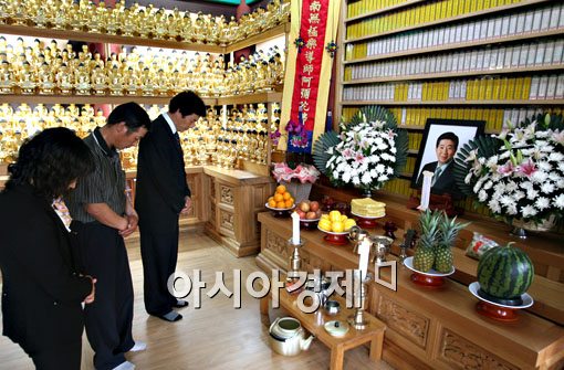 노무현 전 대통령의 위패가 26일 경남 김해 봉화산에 위치한 정토원에 모셔져 관계자들이 정성스레 준비를 하고 있다.