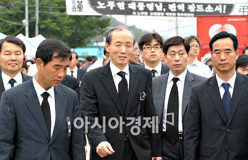 노무현 전 대통령 서거 나흘째인 26일 오후 경남 김해 봉하마을을 방문한 이용훈 대법원장이 유가족들을 만난 후 돌아가고 있다.