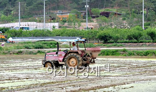 노무현 전 대통령 서거 나흘째인 26일 오후 경남 김해 봉하마을의 한 주민이 모내기를 하기 위한 작업을 하고 있다.