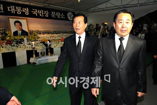 보석으로 풀려난 강금원회장이 26일 봉하마을 노무현 전대통령 빈소를 찾아 조문하고 있다.