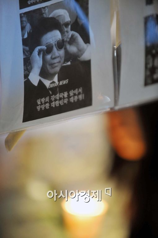 26일 밤 고(故) 노무현 전 대통령의 시민 분향소가 마련된 서울 덕수궁 대한문 앞을 찾은 시민들이 촛불을 들고 지나가고 있다.