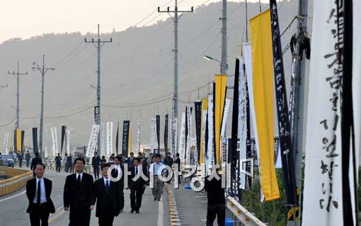 노무현 전 대통령 서거 5일째를 맞은 27일 오전 경남 김해 봉하마을 입구에 자원봉사자들이 만든 만장깃대 5백여개가 조문객들을 맞이하고 있다.