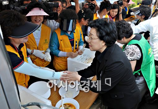 한명숙 노무현 전 대통령 공동장의 위원회 공동위원장이 27일 오후 경남 김해 봉하마을 분향소에서 일하고 있는 자원봉사자를 격려하고 있다.