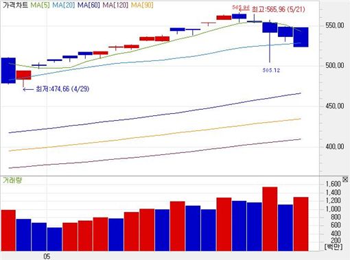 일봉상 460선대 후반에 놓인 60일선이 지지선으로 작용할 가능성도 있으나 전문가들은 주봉 20일선과 월봉 5일선과 일치하는 일봉 90일선(435선)이 더욱 의미있는 지지선으로 작용할 것으로 보고 있다.