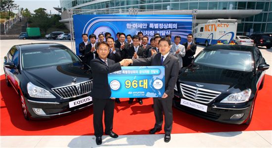 현대차는 지난 27일 제주 국제컨벤션센터(ICC)에서 정진행 현대ㆍ기아차 전략기획담당 부사장, 이지하 한ㆍ아세안 특별정상회의 준비기획단장 등 관계자 100여명이 참석한 가운데 공식차량 전달식을 가졌다.
