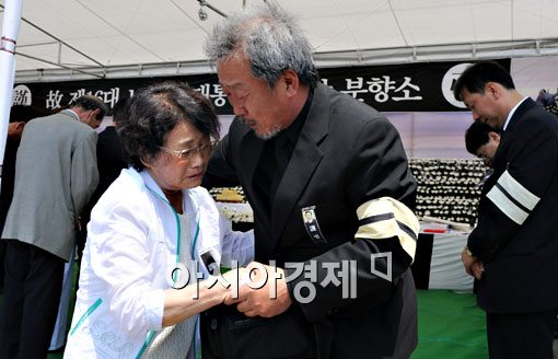 노무현 전 대통령 발인을 하루 앞둔 28일 오전 경남 김해 봉하마을 분향소에서 상주를 대신해 조문객을 맞은 명계남씨가 조문객을 위로 하고 있다.