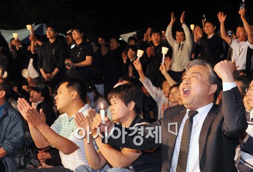 故 노무현 전 대통령 영결식을 앞둔 29일 새벽 경남 김해시 진영읍 봉하마을에서 조문객들이 盧 전 대통령이 생전 즐겨 부르던 양희은의 상록수를 부르고 있다.