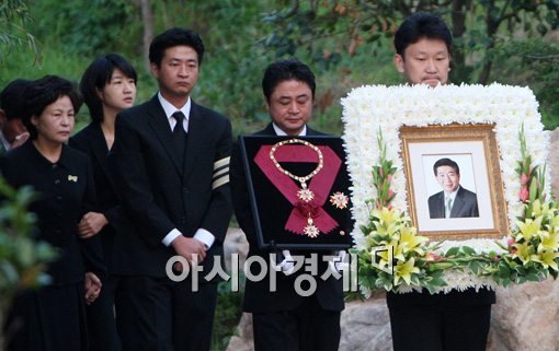 노무현 전 대통령의 부인 권양숙 여사와 아들 노건호씨 등 유족들이 29일 오전 경남 김해 봉하마을에서 노 전 대통령의 발인식을 마친뒤 영정사진을 뒤따르며 사저로 향하고 있다.<사진공동취재단>