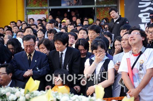 손수건으로 얼굴을 가린 채 소리도 내지 못하고 몸을 떨며 우는 사람, 어린 아이를 품에 안은 채 아이의 머리 위로 연신 뚝뚝 눈물을 떨어뜨리는 사람, 소리내 통곡하는 사람 등 순식간에 봉하마을은 눈물바다가 됐다.