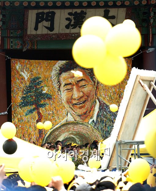 노무현 전 대통령의 영결식이 29일 경북궁에서 마친뒤 노 전 대통령의 운구행렬이 서울광장으로 향하고 있는 가운데 대한문앞 시민 분향소앞에 노란 풍선이 날리고 있다.