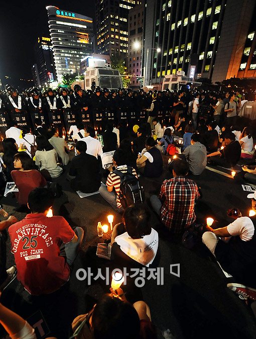 [아시아경제신문 이기범 기자]29일 밤 서울 시청 앞 광장 일대에서 시민들이 촛불을 켜고 경찰과 대치하고 있다.