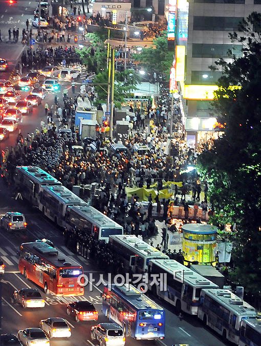 30일 저녁 서울 덕수궁 앞 대한문에서 열린 '5.30 범국민대회'에 참가한 시민들이 촛불을 들고 경찰과 대치하고 있다.