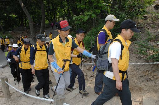 한 조를 이룬 오비맥주 직원들은 시각장애인들의 페이스에 맞춰 손을 잡고 ‘눈앞에 장애물이 있다, 계단이 있다 등등’을 알려줬다. 등반이 끝난 이후에는 함께 식사를 하며 등반을 마무리했다.