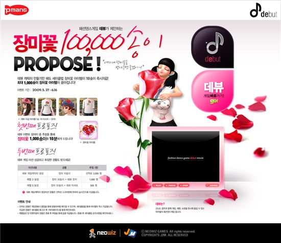 네오위즈게임즈(대표 이상엽)는 게임포털 피망에서 서비스 하는 댄스게임 '데뷰(debut)'가 '세이클럽'과 제휴를 맺고 '장미꽃 10만 송이 프로포즈' 이벤트를 진행한다고 1일 밝혔다.
