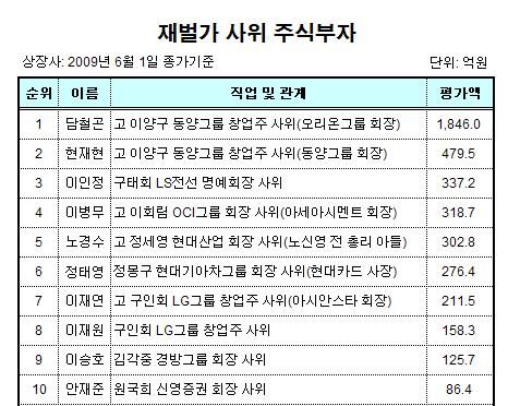 구태회 LS그룹 명예회장의 막내 사위 이인정씨가 337억원으로 3위에 올랐고 고 이회림 OCI(옛 동양화학그룹) 회장의 사위 이병무 아세아시멘트 회장이 318억원 어치 주식을 보유해 4위에 올랐다.