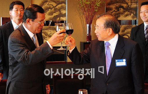 3일 남산 하얏트 호텔에서 조석래 전경련 회장이 훈센 캄보디아 총리와 오찬을 갖기전 건배를 하며 우의를 다지고 있다.