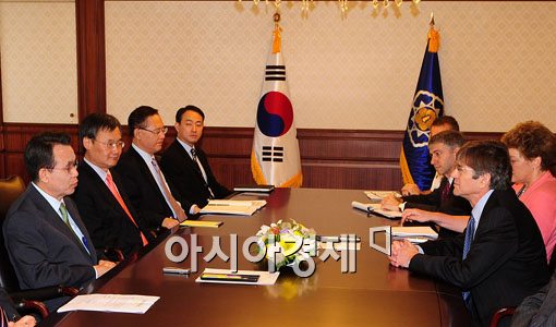 4일 오전 서울 세종로 정부종합청사에서 제임스 스타인버스 국무부 부장관과 한승수 국무총리가 회담을 나누고 맀다.