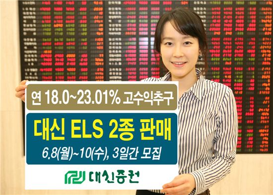 대신증권은 만기 2년짜리 조기상환형 주가연계증권(ELS) 2종을 오는 8일부터 10일까지 각 영업점에서 판매한다고 7일 밝혔다.