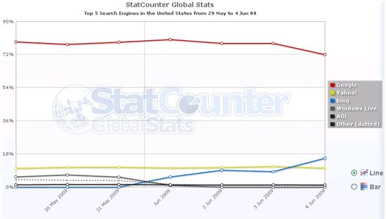 자료를 보면 빙의 선전으로 구글의 점유율이 다소 하락한 것으로 나타나 빙이 구글과 맞대결을 펼치는 것이 아니냐는 분석이 제기되고 있다.