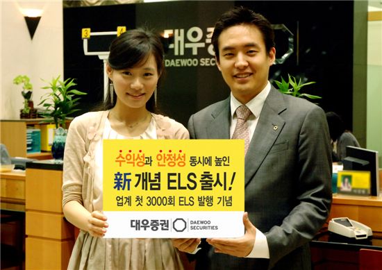 대우증권이 주가연계증권(ELS) 발행 3000회를 기념해 오는 9일부터 수익성과 안정성을 동시에 높인 신개념 ELS 2종을 포함해 총 ELS 5종을 공모한다고 8일 밝혔다. 이번 'ELS 5종'은 각각 KOSPI200 KB금융 우리금융 현대차 SK텔레콤 등을 기초자산으로 하며 총 700억원 규모다.