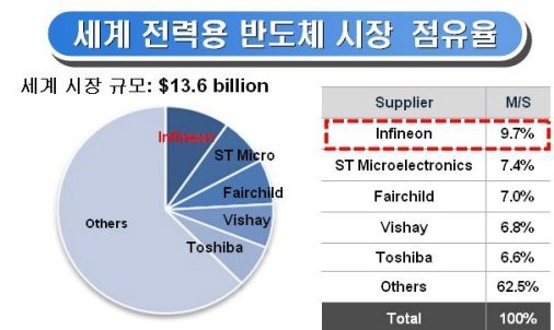 한편, 시장조사기관인 IMS리서치에 따르면 올해 약 127억불(약 15조9700억원) 규모였던 전력용반도체의 세계 시장 규모는 오는 2012년께 156억불(약 19조6100억원) 규모로 성장할 전망이다. 합작법인 설립에 참여한 인피니언 테크놀로지는 전력용반도체 모듈 분야 시장점유율 세계 1위 업체로, 지난해 매출은 약 7조8000억원이었다.