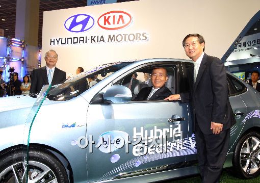 사진 오른쪽부터 양웅철 현대기아차 연구개발총괄본부장(차량 우측), 이만의 환경부 장관(차량 내), 손경식 환경보전협회장(차량 뒷편)이 아반떼 LPI 하이브리드카와 함께 기념촬영을 하고 있다.