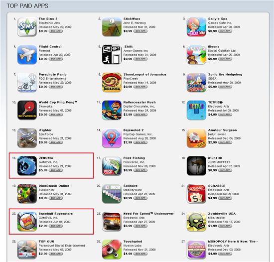 게임빌에 따르면 현재 모바일 롤플레잉게임(RPG) '제노니아(ZENONIA)'가 16위를, 야구게임 '베이스볼 슈퍼스타2009'가 22위를 기록하며 큰 호응을 얻고 있다.
