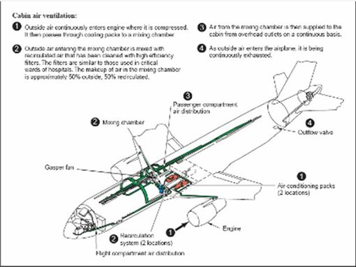 기내의 공기순환 시스템 과정을 살펴보면 먼저 외부 공기가 섭씨 2000도가 넘는 엔진을 통해서 유입되면서 압축된다. 이 때 외부 공기는 섭씨 500도 정도로 가열되며 이 과정을 거치면서 완전히 멸균된 상태가 된다. 신종 플루 바이러스는 70도 이상 가열되면 멸균되는 것으로 알려져 있다.
