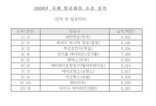 2위와 3위는 케세이패시픽항공(82억4500만Ton-Km)와 루프트한자(81억9400만Ton-Km)가 차지했다.
