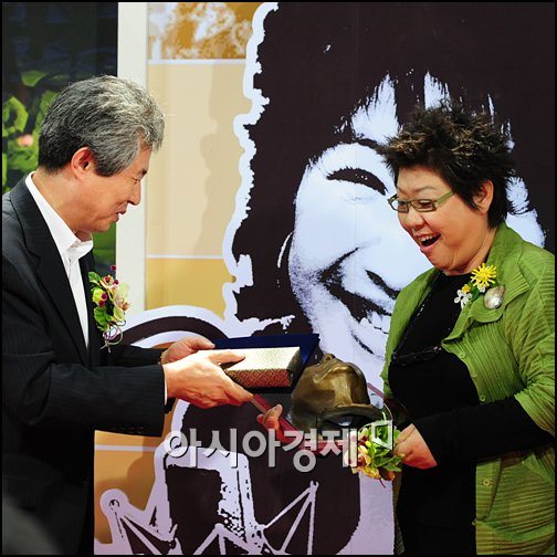 [아시아경제신문 박성기 기자]가수 양희은이 11일 오전 11시 서울 여의도 MBC 방송센터에서 진행된 '2009 브론즈마우스 헌정식'에서 엄기영 사장으로부터 '브론즈마우스'를 받고 있다.