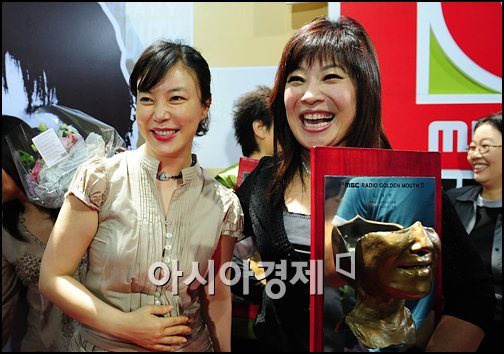 [아시아경제신문 박성기 기자]11일 오전 11시 서울 여의도 MBC 방송센터에서 진행된 '2009 브론즈마우스 헌정식'에서 노사연이 브론즈 마우스를 받은 후, 최화정에게 축하를 받고 있다.