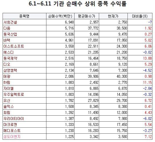 반면 기관은 8일 연속 '팔자' 행진 속에서도 알짜 종목을 매수하고 있다. 기관이 지난 1일부터 11일까지 서희건설(69억4800만원 순매수)과 다음(57억1600만원), 동국산업(56억3600만원), 바텍(49억6100만원), 이스트소프트(35억5800만원) 등의 순으로 순매수했다.