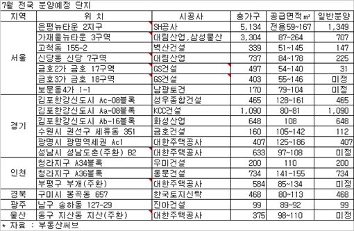 13일 부동산정보업체 부동산써브에 따르면 7월 전국 19개 사업장에서는 총 1만6447가구가 공급된다. 이중 6682가구가 일반분양 대상이다. 서울이 2459가구(7곳) , 경기ㆍ인천이 3656가구(9곳)다. 지방은 567가구(3곳)에 불과하다.