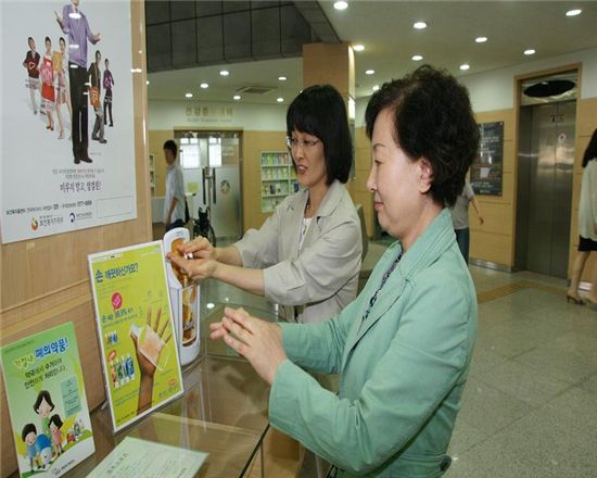 구는 직원과 민원인을 대상으로 손소독제의 손씻기의 중요성을 알리고 최근 유행하고 있는 신종인플루엔자, A형 간염, 수족구병과 여름철에 주로 발생하기 쉬운 식중독 등 각종 전염병을 예방하기 위해 체험코너를 설치했다.