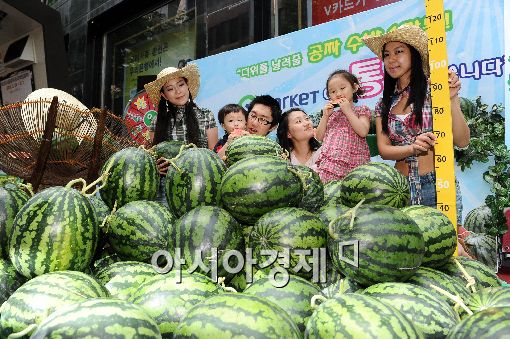 G마켓이 16일 오전 서울 명동 거리에서 수박 1만통을 무료로 제공하는 ‘무더위를 날려줄 1만통 수박의 추억’ 이벤트를 진행했다. 이날 ‘수박 높이 쌓기 대회’에 참여한 한 가족이 수박을 쌓으며 즐거운 시간을 보내고 있다.